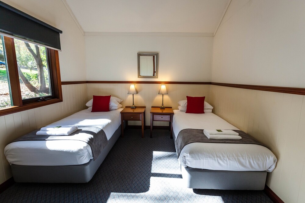As you drive into the forest-meets-ocean town of Margaret River you may not even realise that, hidden in the tall trees to your right, are rustic wooden cabins, rolling green lawns, and a bubbling winter brook.