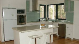 The main dining and living areas are open plan in design, with raked ceiling, celestory glazing, and a log fire with double glass doors that was imported from France. Perfect to curl up in front of while enjoying a glass of red on the coldest of winter nights.