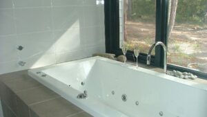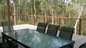 Braidwood Escape is a luxurious home, architect designed, with construction completed in 2009. The design features covered links separating the bedrooms from the main living areas of the house, tasmanian oak flooring throughout, and extensive glazing affording fantastic forest views from all parts of the home. The house is memorable for its massive rear alfresco deck which is furnished with an outdoor dining setting, gas barbeque and sun lounges.