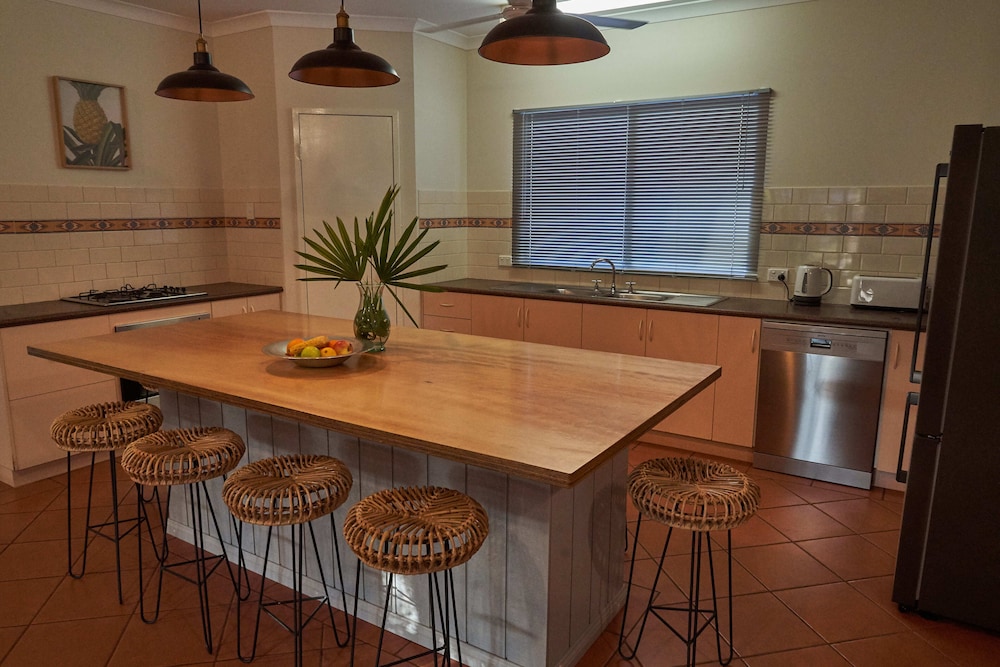 The large kitchen is fully equipped with a fridge/freezer, gas cook-top, oven and dishwasher. A funky timber kitchen bench/table seats 8. The kitchen is part of a large open-plan living area, which has comfortable leather sofas and chairs for relaxing in front of a smart TV. Local artwork brings elements of the Kimberley into the space, and timber furniture gives the house a relaxed tropical feel.