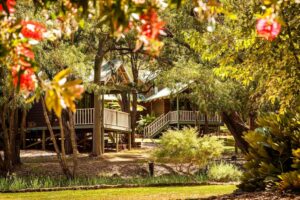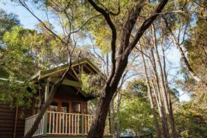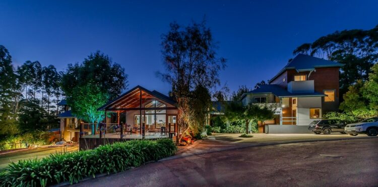 As you drive into the forest-meets-ocean town of Margaret River you may not even realise that, hidden in the tall trees to your right, are rustic wooden cabins, rolling green lawns, and a bubbling winter brook.