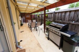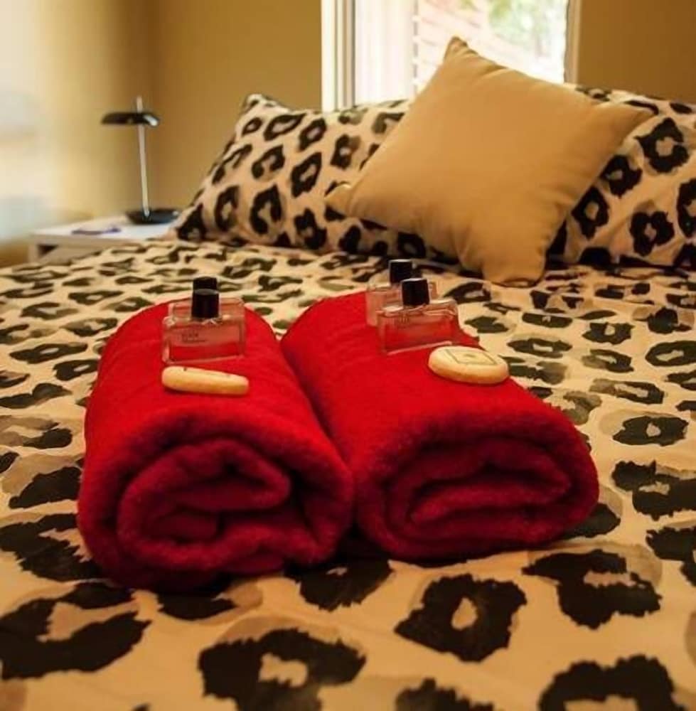 Also featured are a separate lounge room with Satellite TV, Free to air TV, No wifi is provided and a stocked kitchenette (NO INDOOR STOVE) with tea-coffee, toaster,microwave and fridge, WC, bathroom with bath & shower, towels supplied, linen provided, washing machine & dryer, a private covered pergola area with BBQ and dining facilities and an outdoor courtyard and deck under the shade of the peppi trees. No wifi is provided.
