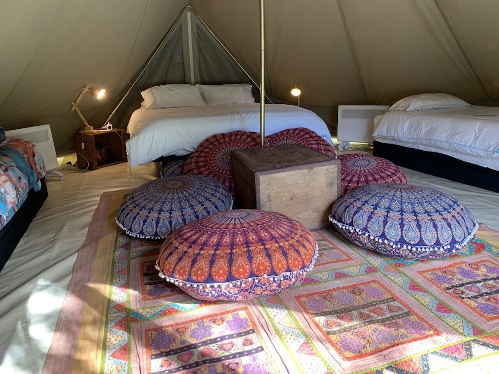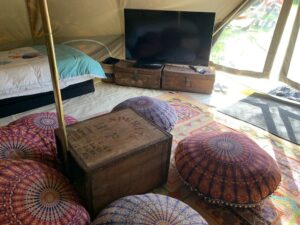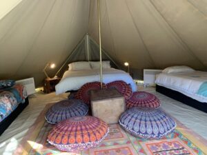 This top of the range Tent is set on our stunning 5 acre property. The Tent is completely waterproof and is fitted with a toasty warm heater inside for winter and airconditioning and fans during summer
