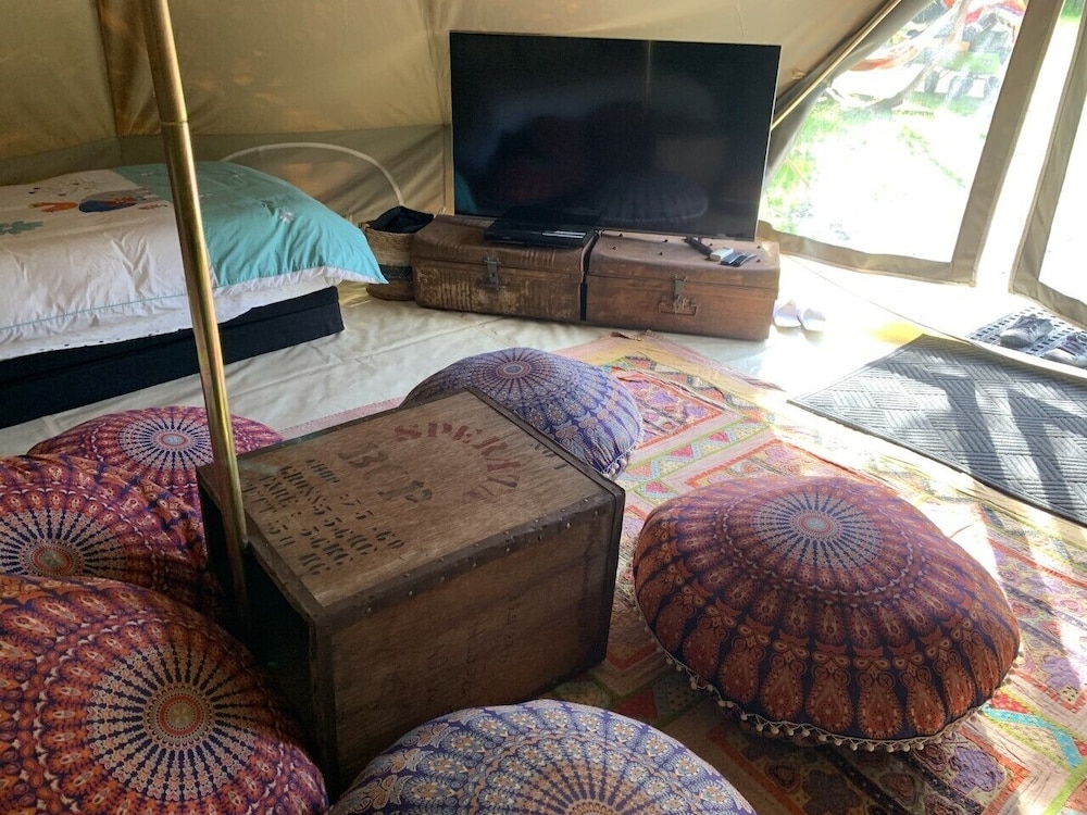 Luxury 6 metre Bell Tent with TV, WIFI, Aircond/Heating, Tempur Zero Gravity Electric bed & Australia’s most unique bathroom built inside a repurposed Rainwater Tank with outdoor bath & Firepit.