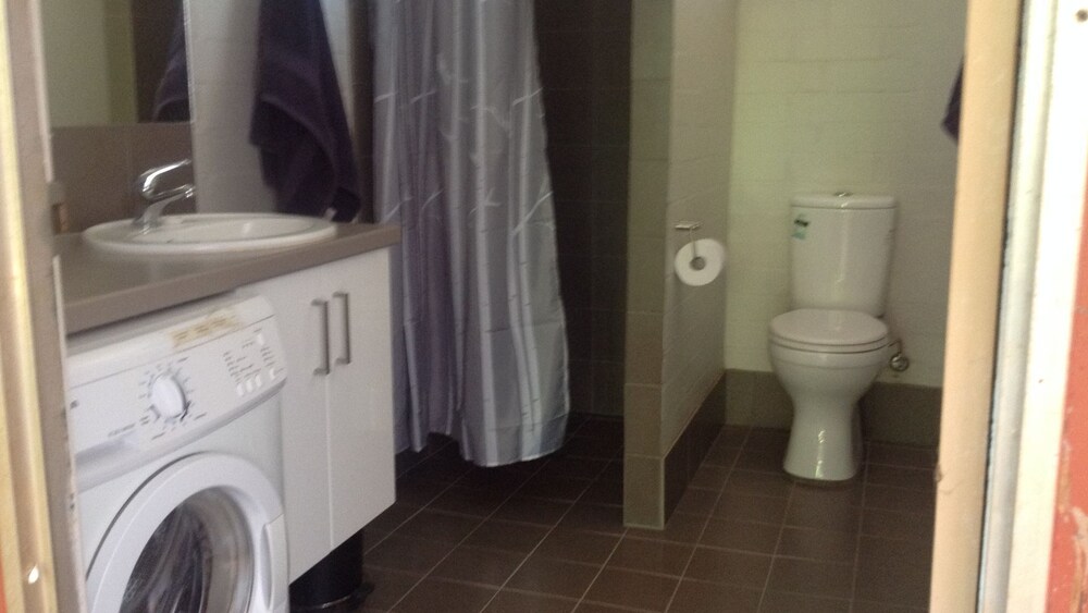 The private external on-site ablution block consists of a front load washing machine, shower & toilet, as well as a swimming pool only 100m walk through the caravan park.
