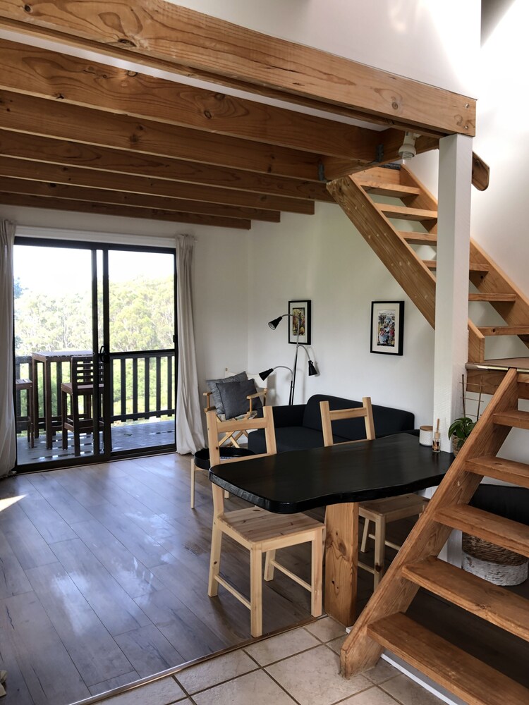 Our studio treehouse is a semi detached apartment next to our Heidi Chalet with breathtaking valley views. The bedroom is located on the upper floor whilst the ground floor has an open plan living,dining and kitchen, plus your bathroom. A small deck/balcony overlooks the valley.