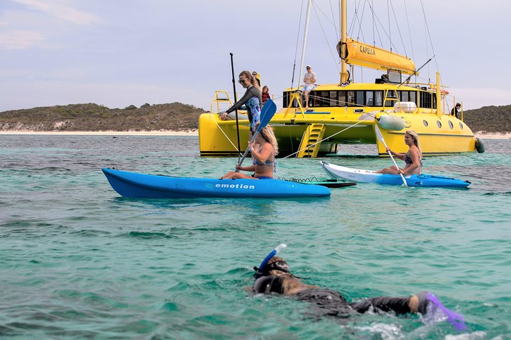 The clear, calm, shallow waters of Carnac Island allow Capella to venture almost right up to the shore where you can literally step off into waist deep, crystal clear water. Learn about and be entertained by the resident Australian Sea Lions who are often seen basking in the sun on the eastern side. Grab one of the kayaks or SUP, or head off for a snorkel. If the easterly is up no worries! The western side of Carnac is an absolute delight with high limestone cliffs plunging into the water and a truly spectacular anchorage perfect for paddling around.